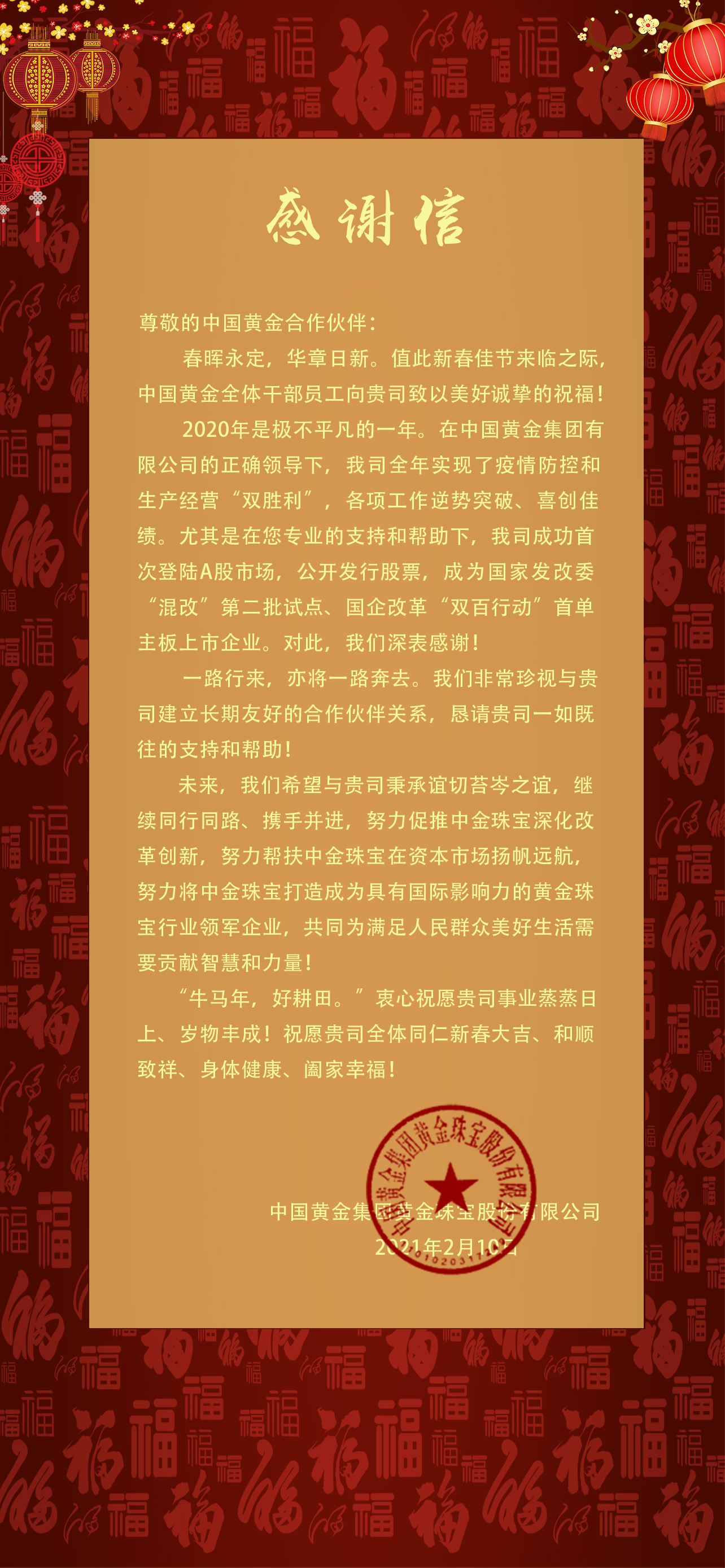致中國黃金合作伙伴的感謝信