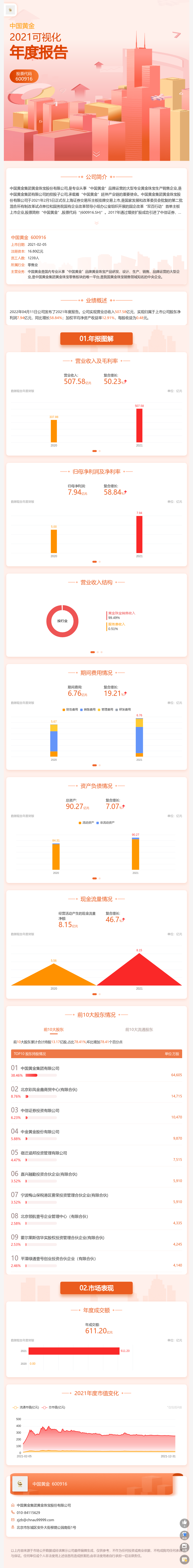 中國黃金是中國黃金集團有限公司的控股子公司,也是集團公司實施“藏金于民”戰(zhàn)略、踐行“黃金為民”理念的橋頭堡和主陣地,承擔(dān)著產(chǎn)業(yè)鏈延伸的重要使命。公司前身成立于2006年,主要從事黃金珠寶的設(shè)計研發(fā)、品牌推廣、生產(chǎn)銷售及投資服務(wù),經(jīng)過多年的培育和發(fā)展,目前公司在全國擁有共計3721家零售店面,擁有較高的品牌知名度、美譽度和影響力,企業(yè)綜合實力行業(yè)領(lǐng)先,是集團公司業(yè)績增長最快、競爭力最強、效益最優(yōu)的板塊企業(yè)之一。自2017年開始,公司先后成為國家發(fā)改委“混改”試點和國務(wù)院國資委“雙百企業(yè)”,并在2021年2月5日,成功邁進了資本市場大門,成為發(fā)改委混合所有制第二批試點單位及國資委“雙百企業(yè)”首單主板上市企業(yè),創(chuàng)造了連續(xù)11天漲停、最高漲幅達356%的好成績,“混改”迎來重要里程碑,取得階段性勝利。同時,公司經(jīng)營業(yè)績在上市當(dāng)年便取得量級突破,創(chuàng)下歷史新高:實現(xiàn)銷售收入508億元、利潤超過10億元,并榮獲國資委頒發(fā)的“中央企業(yè)先進基層黨組織”和“管理提升標(biāo)桿企業(yè)”。