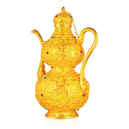 以故宮館藏鏨云龍葫蘆式金執(zhí)壺為原型。整體呈葫蘆形,直口短頸,外撇式圈足,壺身通體鏨刻云紋,云海中鏨二龍戲珠紋,執(zhí)壺有蓋,蓋及壺身鑲嵌寶石共計32顆。